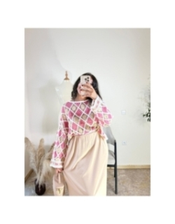 Adoptez une allure bohème et élégante avec ce magnifique pull en maille crochet ajourée. Son design unique aux motifs géométriques roses, beiges et blancs offre une légèreté parfaite pour les journées ensoleillées. Idéal pour un look décontracté-chic, il apportera une touche d'originalité à votre garde-robe estivale.