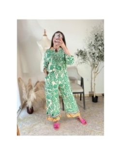 Succombez au charme de cet ensemble fluide et léger, parfait pour une allure décontractée et élégante. Son motif imprimé vibrant, associant le vert et le beige à des touches d'orange et de fuchsia, vous assure un style unique et ensoleillé. Conçu pour le confort, il se compose d'une chemise ample et d'un pantalon palazzo à taille élastiquée, idéal pour toutes vos escapades estivales.