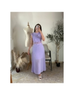 Laissez-vous séduire par cet ensemble deux pièces lavande, parfait pour une allure chic et raffinée. Le crop top délicat est orné de broderies en dentelle et de manches volantées, tandis que la jupe longue plissée offre un mouvement aérien et élégant. Idéal pour les événements spéciaux ou un look estival sophistiqué.