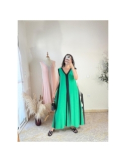 Adoptez un look moderne et raffiné avec cette robe longue bicolore vert émeraude et noir. Sa coupe ample et fluide assure un confort optimal tout en soulignant une silhouette élégante. Idéale pour les journées estivales ou une soirée décontractée, elle allie style et aisance avec ses lignes verticales flatteuses.
